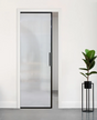 This fluted glass door is a metal glass barn door with safty reeded glass and satin black aluminium frame. It is is perfect for use in bathrooms.